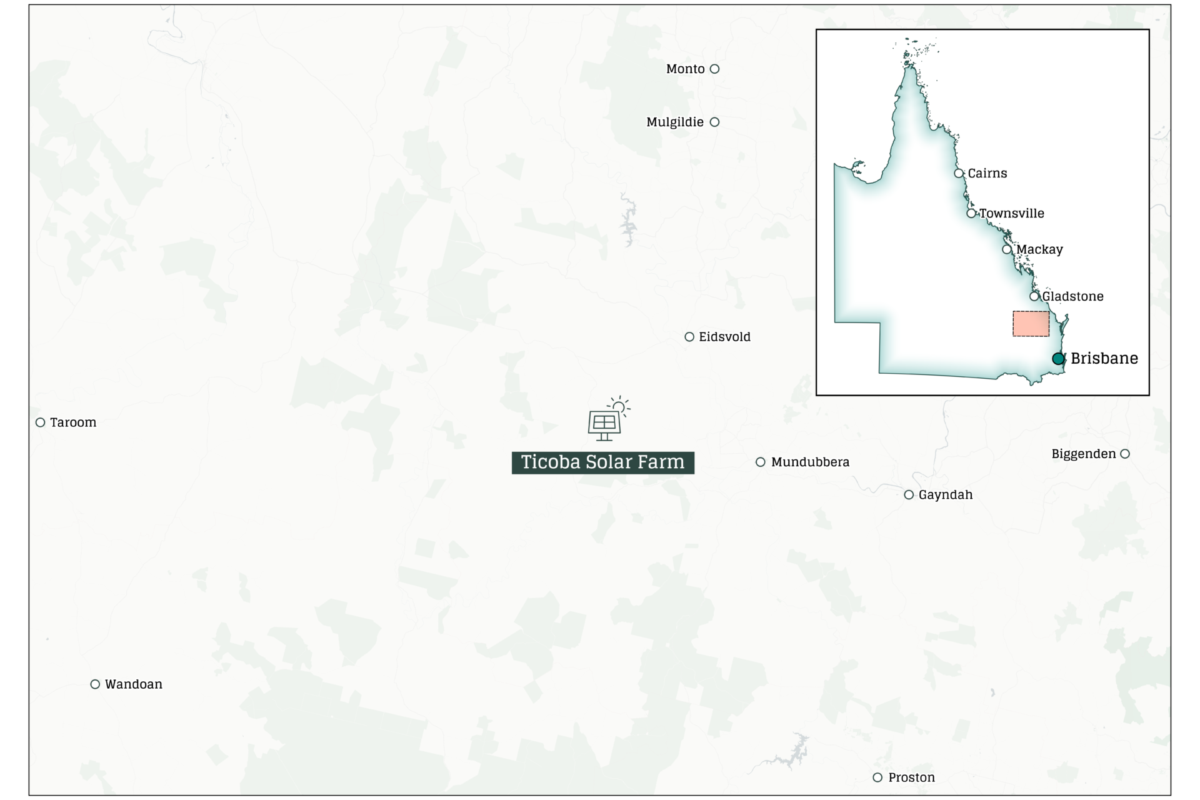 Ticoba Solar Farm is a proposed 484-megawatt project to be located 33 kilometres west of Mundubbera in Central Queensland, in the North Burnett Shire. Approximately 750 000 solar photovoltaic panels will be hosted on an operational property and co-exist with agricultural practices. The area was chosen for its high solar resource, its proximity to existing transmission lines and its low impact on environmental and social values. The project has the potential to produce enough electricity to power around 260,000 homes.